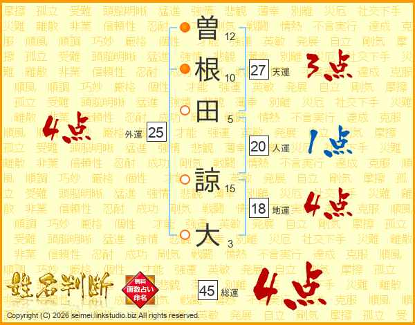 曽(12画)根(10画)田(5画) 諒(15画)大(3画)