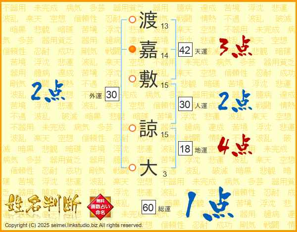渡(13画)嘉(14画)敷(15画) 諒(15画)大(3画)