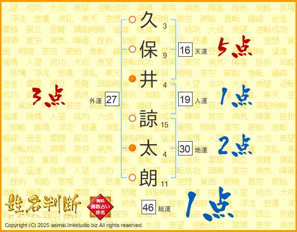 久(3画)保(9画)井(4画) 諒(15画)太(4画)朗(11画)