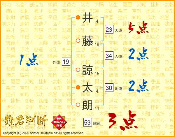 井(4画)藤(19画) 諒(15画)太(4画)朗(11画)