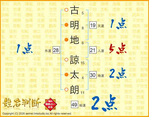 古(5画)明(8画)地(6画) 諒(15画)太(4画)朗(11画)