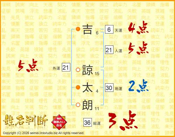 吉(6画) 諒(15画)太(4画)朗(11画)