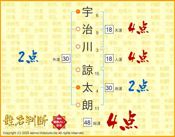 宇(6画)治(9画)川(3画) 諒(15画)太(4画)朗(11画)