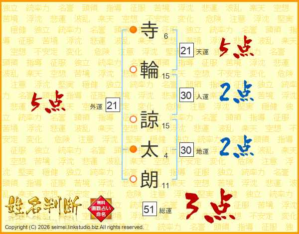 寺(6画)輪(15画) 諒(15画)太(4画)朗(11画)
