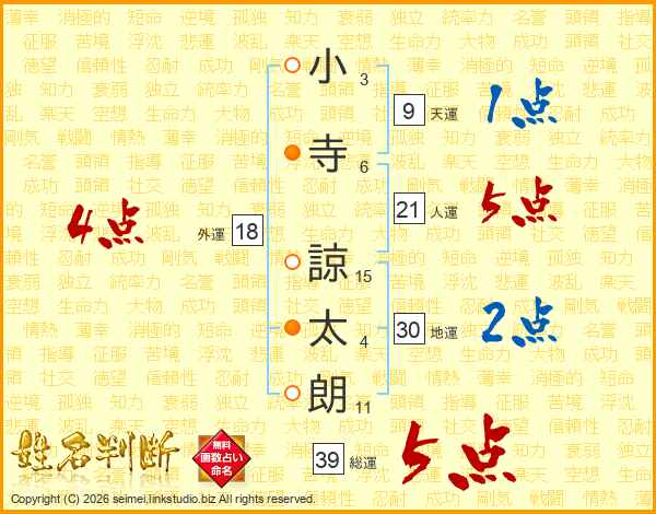 小(3画)寺(6画) 諒(15画)太(4画)朗(11画)