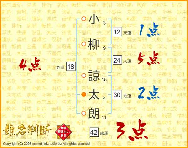 小(3画)柳(9画) 諒(15画)太(4画)朗(11画)
