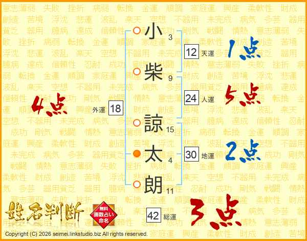 小(3画)柴(9画) 諒(15画)太(4画)朗(11画)