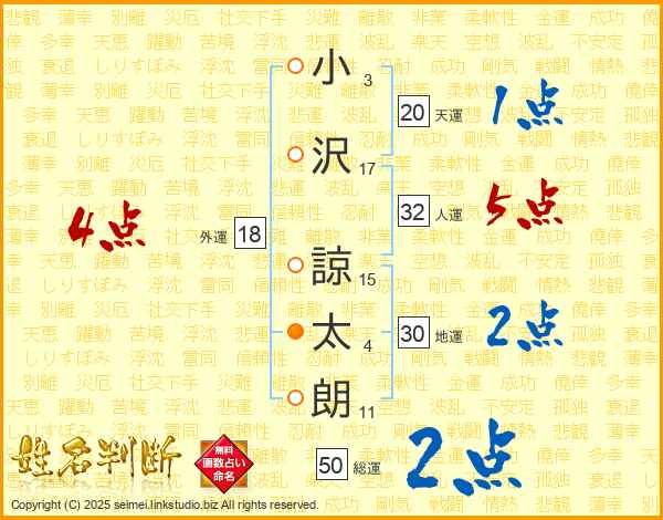 小(3画)沢(17画) 諒(15画)太(4画)朗(11画)