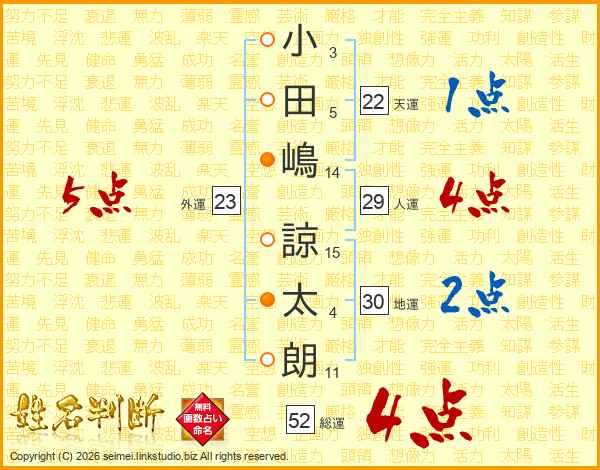 小(3画)田(5画)嶋(14画) 諒(15画)太(4画)朗(11画)