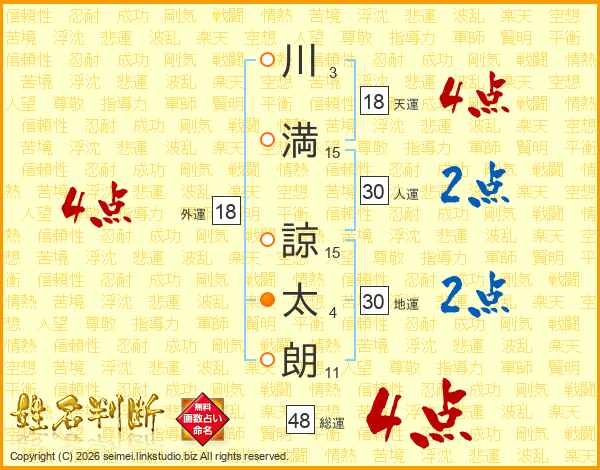 川(3画)満(15画) 諒(15画)太(4画)朗(11画)