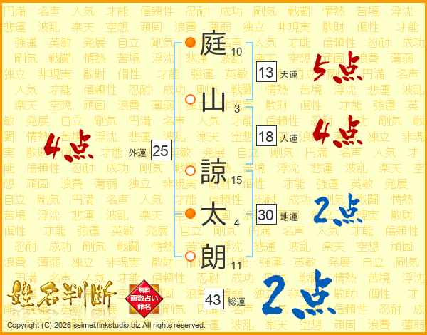 庭(10画)山(3画) 諒(15画)太(4画)朗(11画)