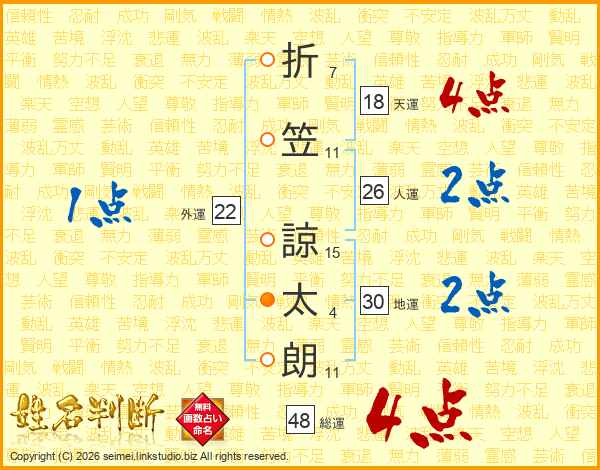 折(7画)笠(11画) 諒(15画)太(4画)朗(11画)