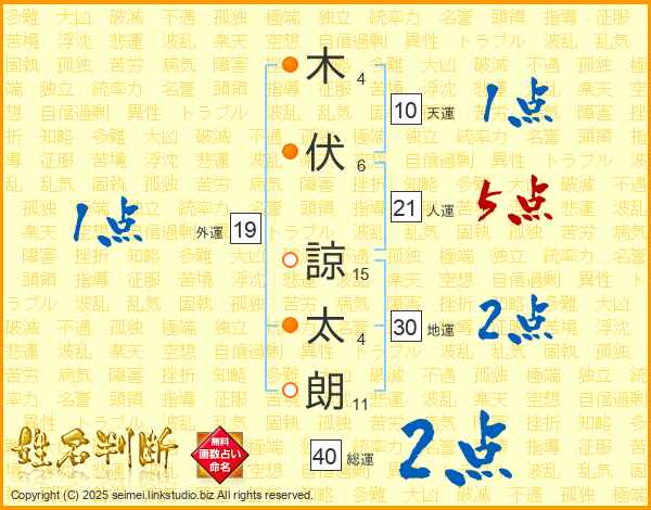 木(4画)伏(6画) 諒(15画)太(4画)朗(11画)