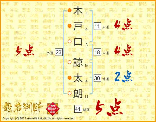木(4画)戸(4画)口(3画) 諒(15画)太(4画)朗(11画)