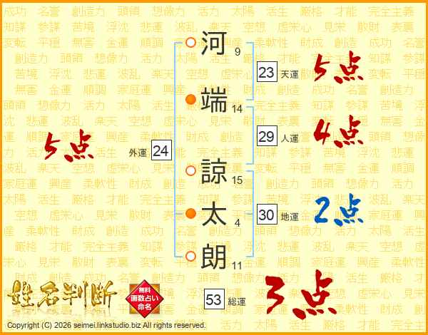 河(9画)端(14画) 諒(15画)太(4画)朗(11画)