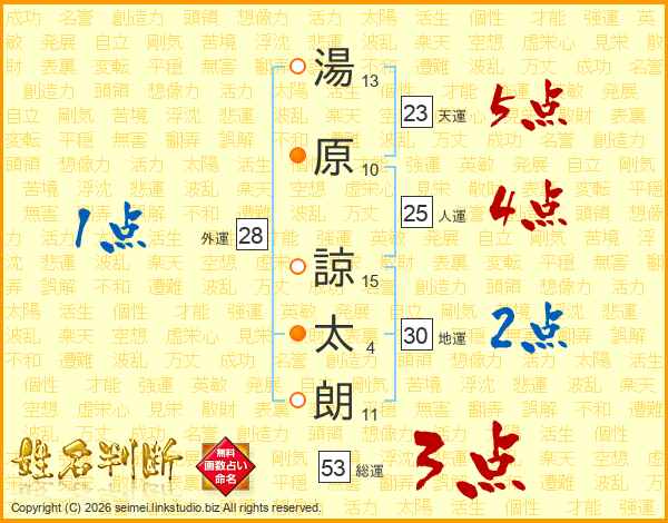 湯(13画)原(10画) 諒(15画)太(4画)朗(11画)