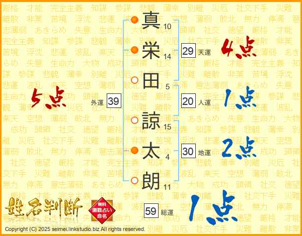 真(10画)栄(14画)田(5画) 諒(15画)太(4画)朗(11画)