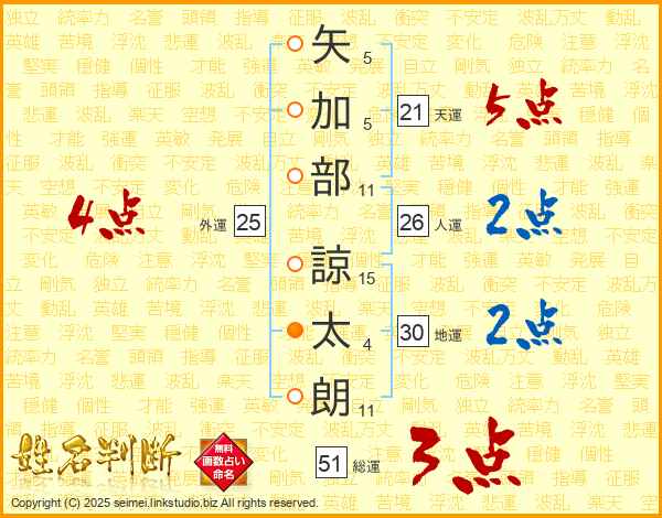 矢(5画)加(5画)部(11画) 諒(15画)太(4画)朗(11画)