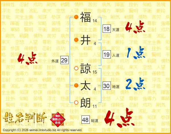 福(14画)井(4画) 諒(15画)太(4画)朗(11画)