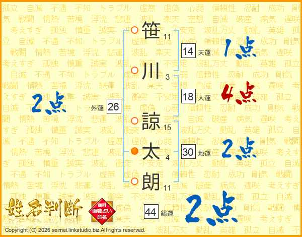 笹(11画)川(3画) 諒(15画)太(4画)朗(11画)
