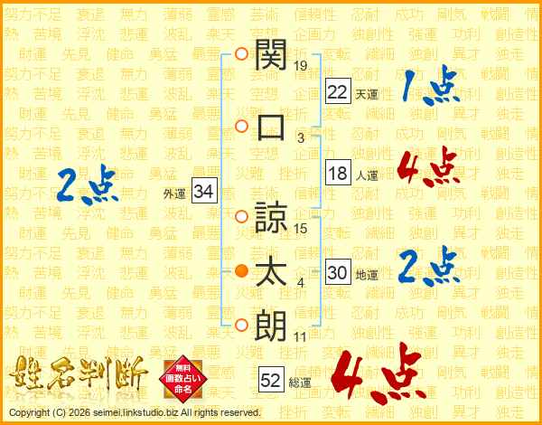 関(19画)口(3画) 諒(15画)太(4画)朗(11画)