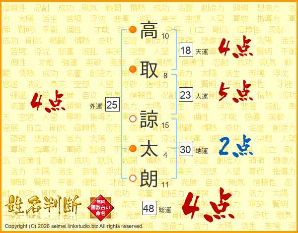高(10画)取(8画) 諒(15画)太(4画)朗(11画)