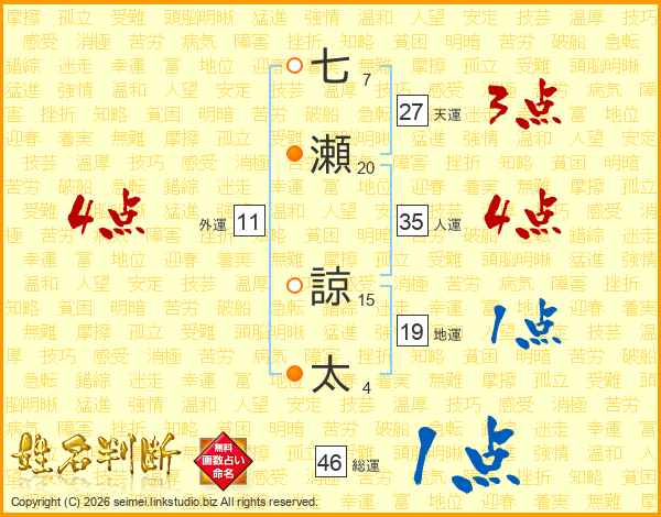 七(7画)瀬(20画) 諒(15画)太(4画)