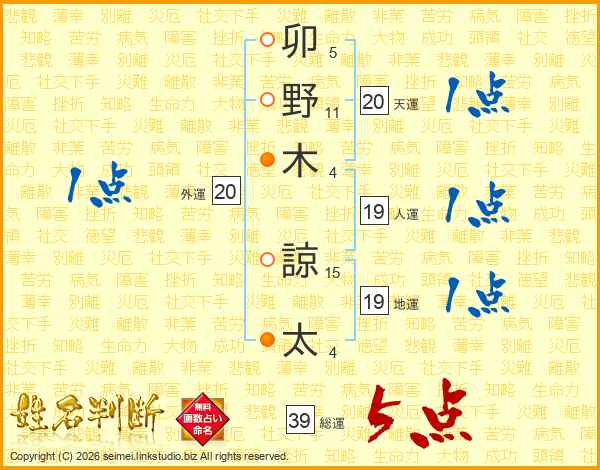 卯野木諒太さんの総運は39画の5点!