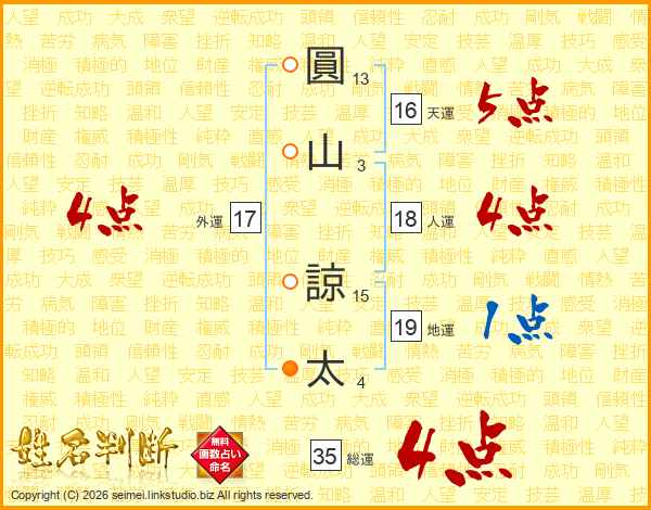 圓(13画)山(3画) 諒(15画)太(4画)
