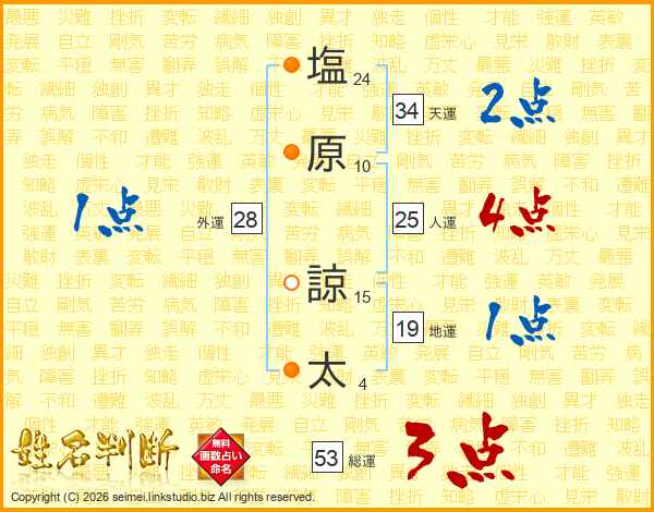 塩(24画)原(10画) 諒(15画)太(4画)