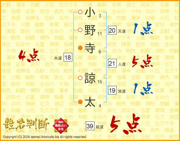 小野寺諒太さんの総運は39画の5点!