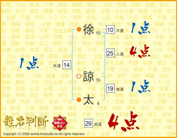 生活面を象徴する運勢です。外部から受ける影響力を表し、結婚運、家庭運や職場、環境への順応性を表します。総運から人運を引いた画数。姓や名が1文字の場合を除く。