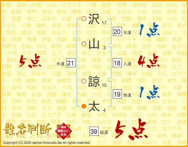 沢山諒太さんの総運は39画の5点!