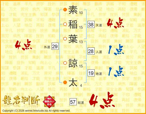 素(10画)稲(15画)葉(13画) 諒(15画)太(4画)