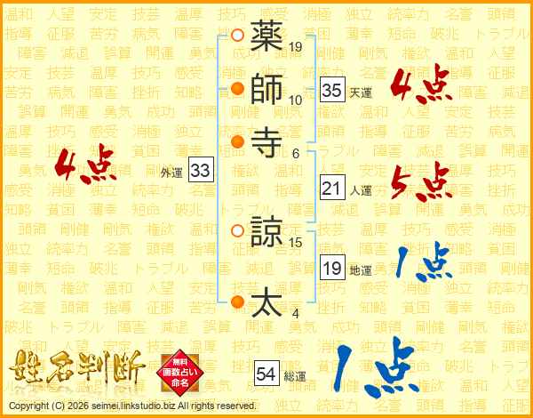 薬(19画)師(10画)寺(6画) 諒(15画)太(4画)