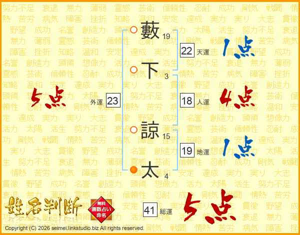生活面を象徴する運勢です。外部から受ける影響力を表し、結婚運、家庭運や職場、環境への順応性を表します。総運から人運を引いた画数。姓や名が1文字の場合を除く。