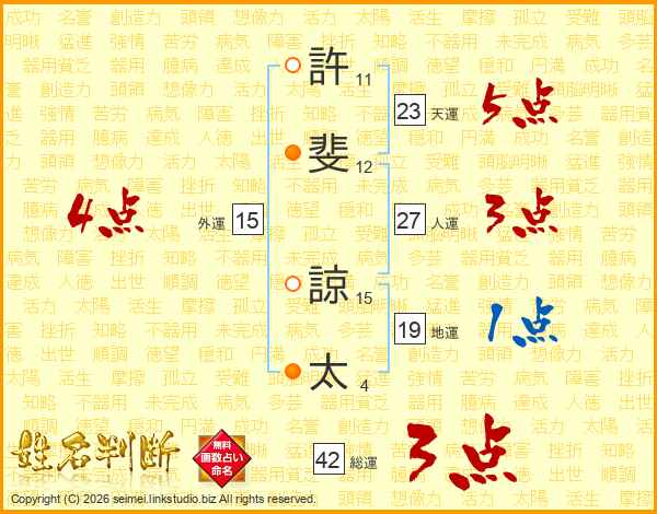 許(11画)斐(12画) 諒(15画)太(4画)