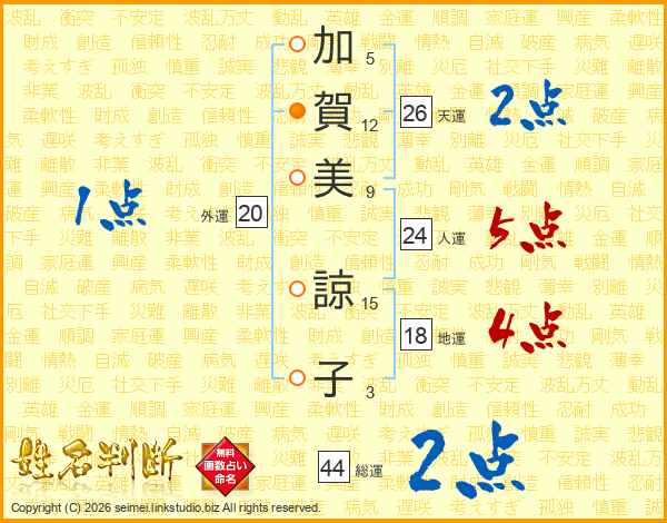 加(5画)賀(12画)美(9画) 諒(15画)子(3画)