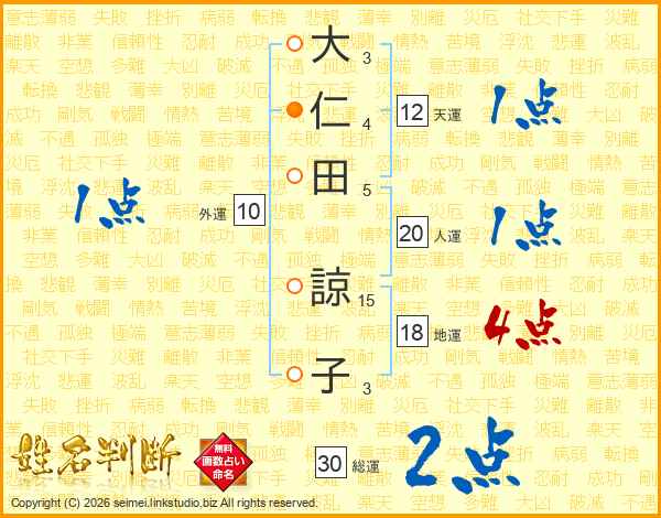 大(3画)仁(4画)田(5画) 諒(15画)子(3画)