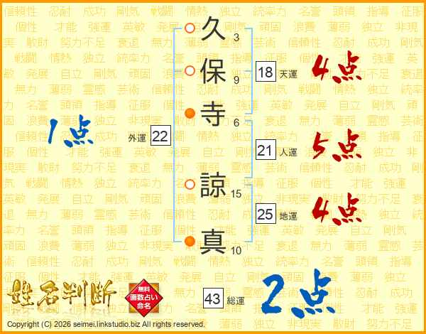 久(3画)保(9画)寺(6画) 諒(15画)真(10画)