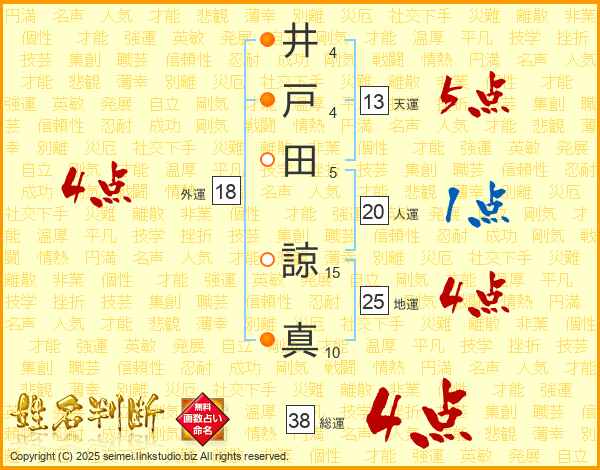 井(4画)戸(4画)田(5画) 諒(15画)真(10画)