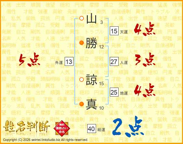 生活面を象徴する運勢です。外部から受ける影響力を表し、結婚運、家庭運や職場、環境への順応性を表します。総運から人運を引いた画数。姓や名が1文字の場合を除く。