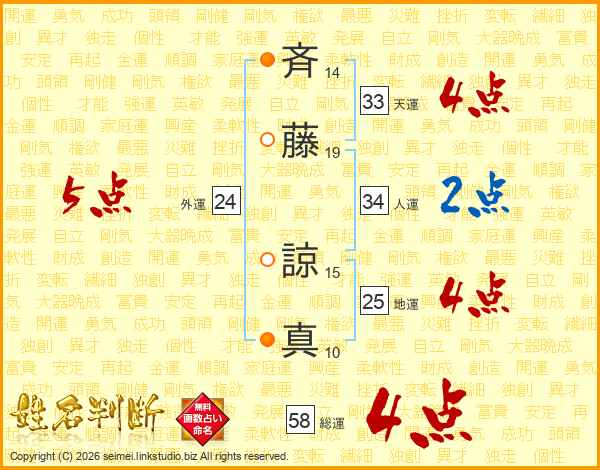 斉(14画)藤(19画) 諒(15画)真(10画)