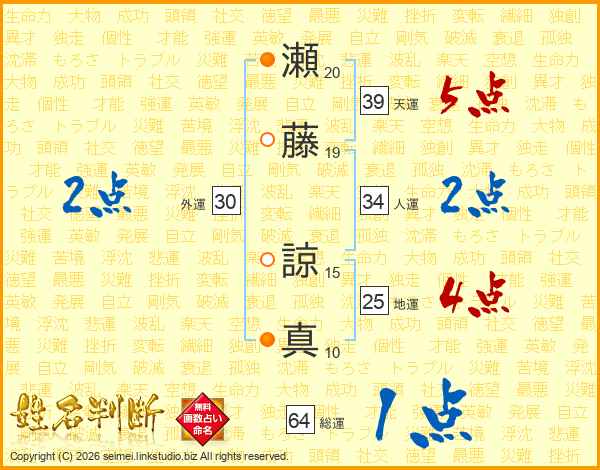 瀬(20画)藤(19画) 諒(15画)真(10画)