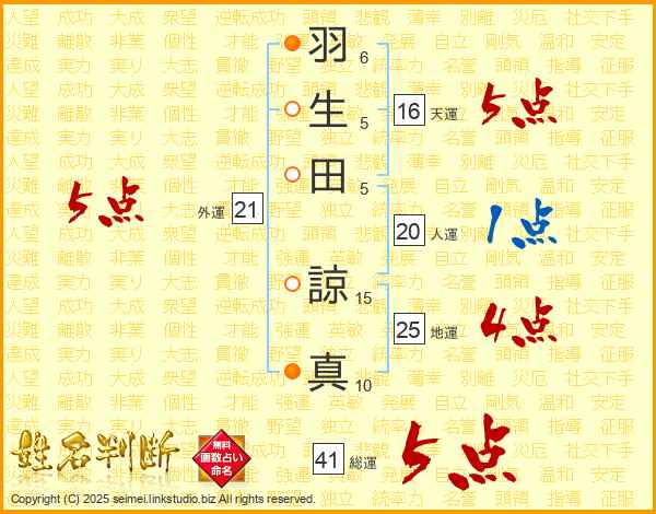 羽(6画)生(5画)田(5画) 諒(15画)真(10画)