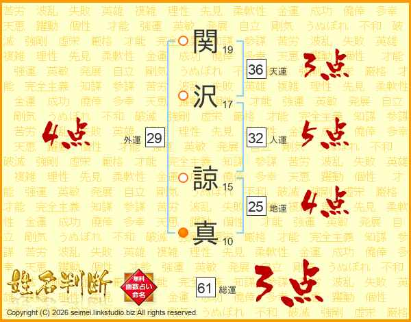 関(19画)沢(17画) 諒(15画)真(10画)