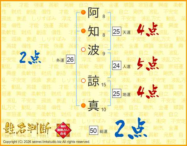 阿(8画)知(8画)波(9画) 諒(15画)真(10画)