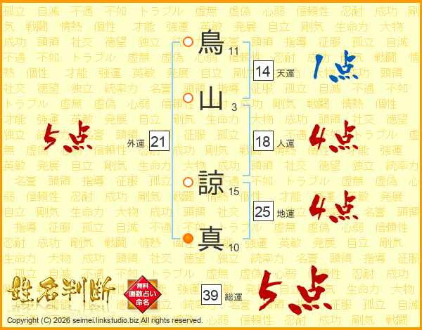 鳥山諒真さんの総運は39画の5点!