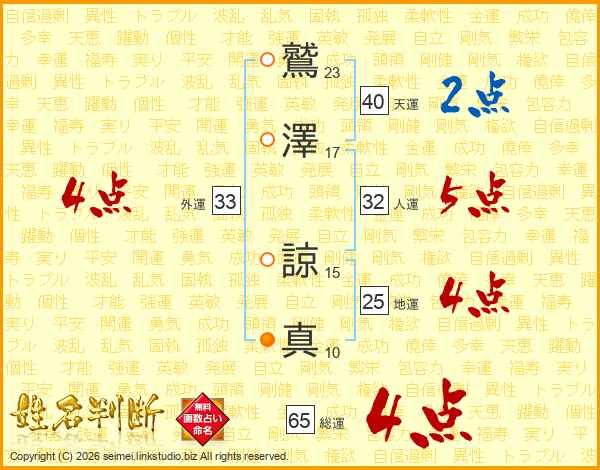 鷲(23画)澤(17画) 諒(15画)真(10画)