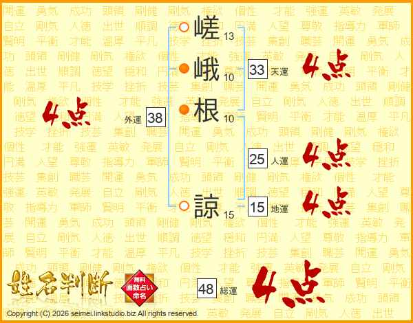 嵯(13画)峨(10画)根(10画) 諒(15画)